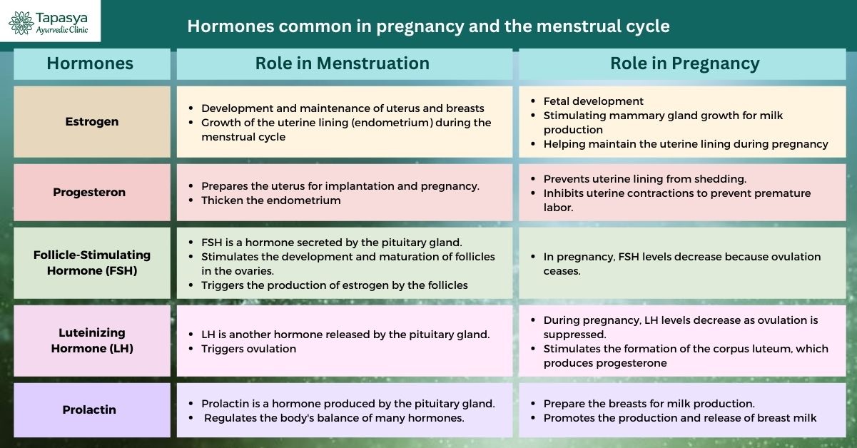 During pregnancy and the menstrual cycle, several hormones play crucial roles in regulating and coordinating the physiological changes that occur in a woman's body. Here are some of the hormones commonly involved in both pregnancy and the menstrual cycle, along with their functions: